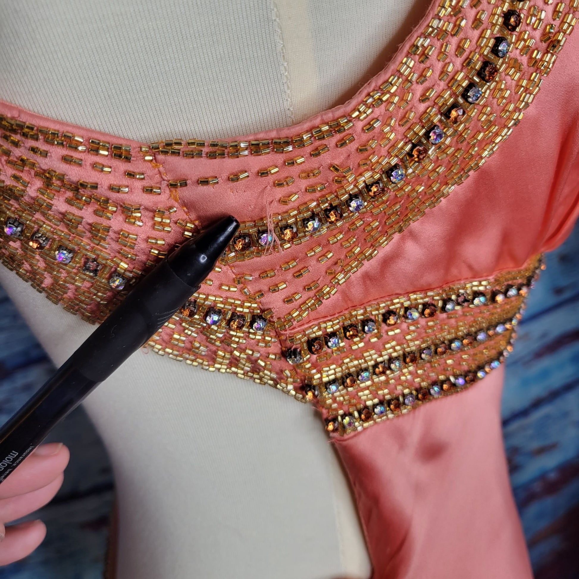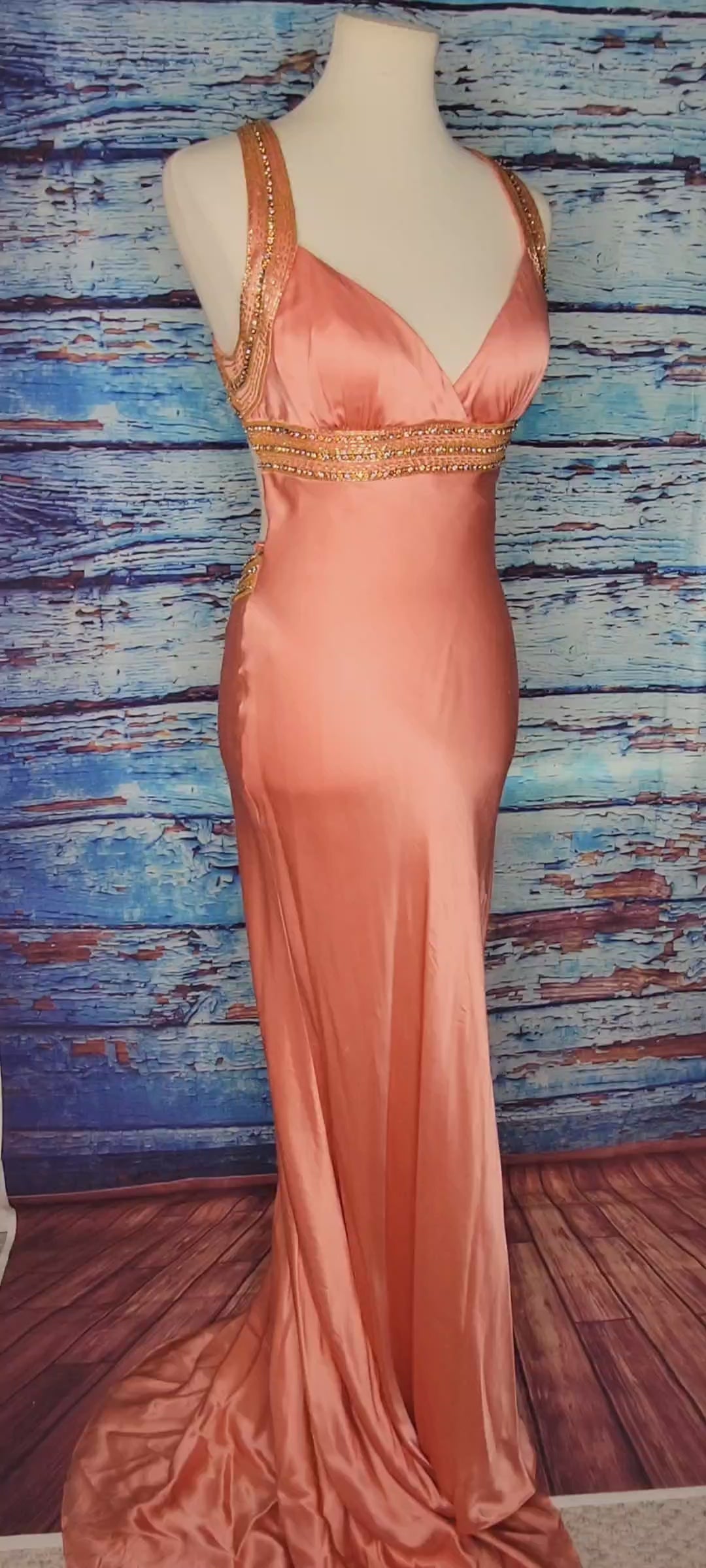 Absolutely beautiful dress. Crisscross back. Very flattering cut and sexy as hell. A few beads loose and missing (see photos). G
