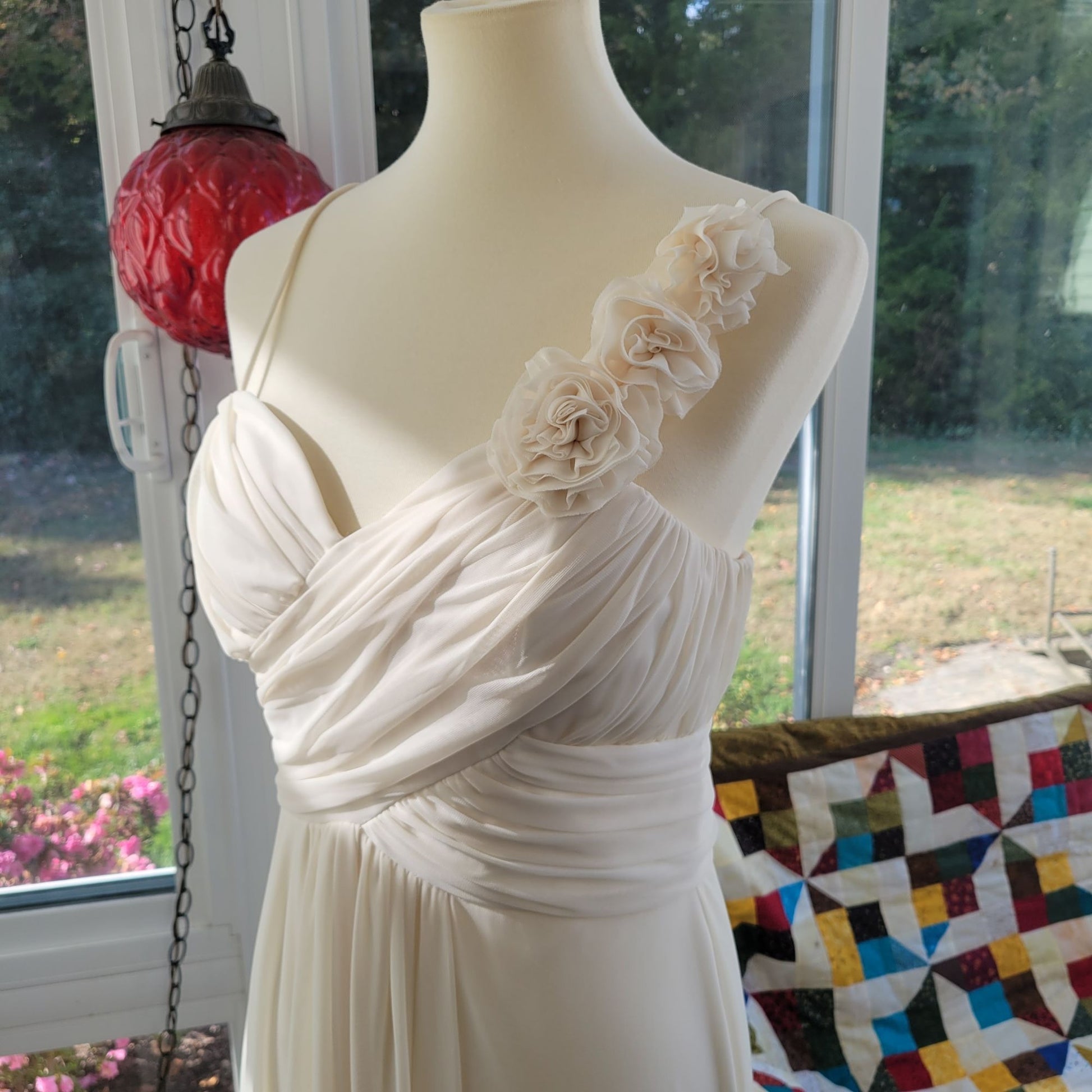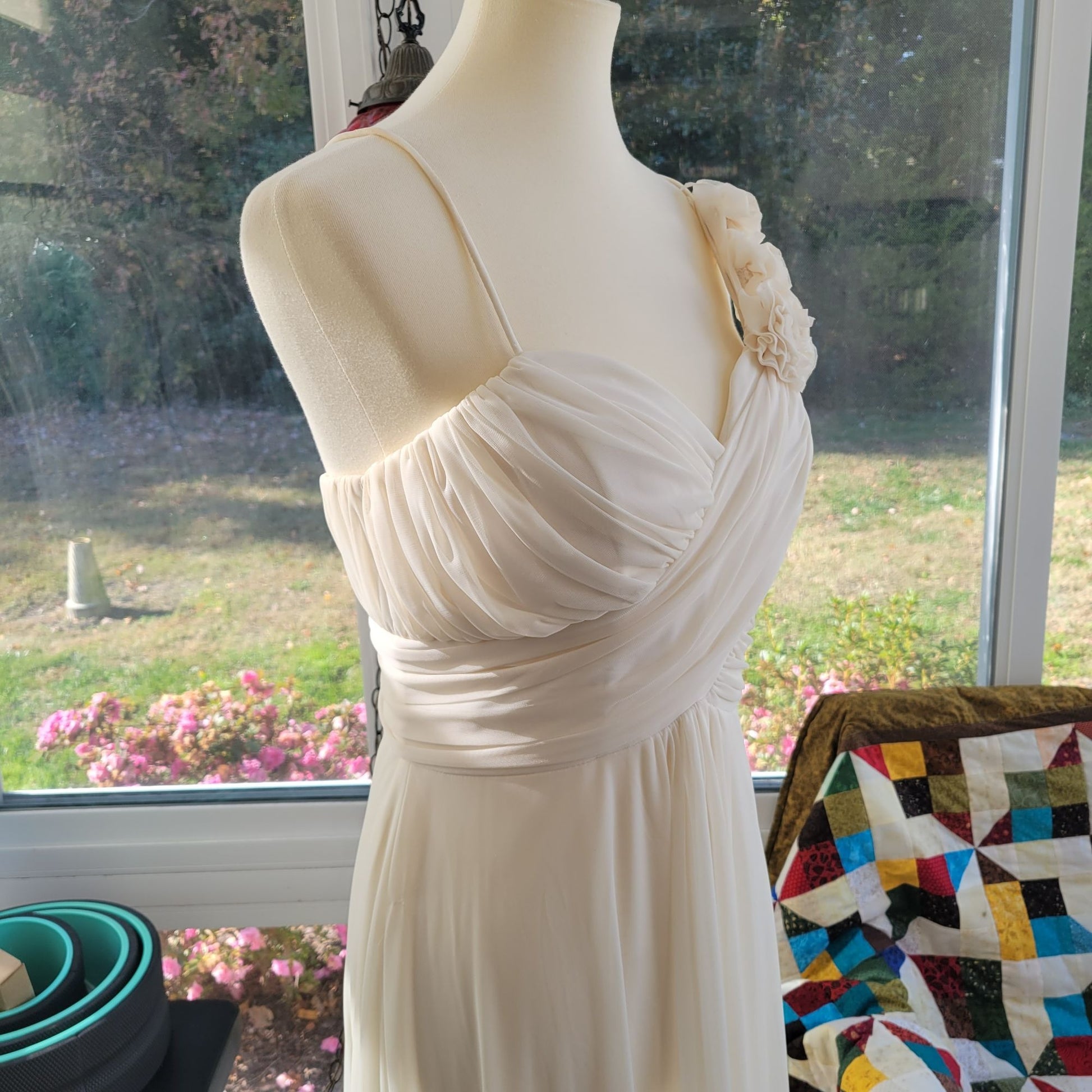 This is a beautiful wispy and flowy dress by Cindy. It is an ivory color. The dress needs to be dry cleaned. There is staining on the inside of the bodice. See pictures. It's not horrible and doesn't show. Just needs to be mentioned.