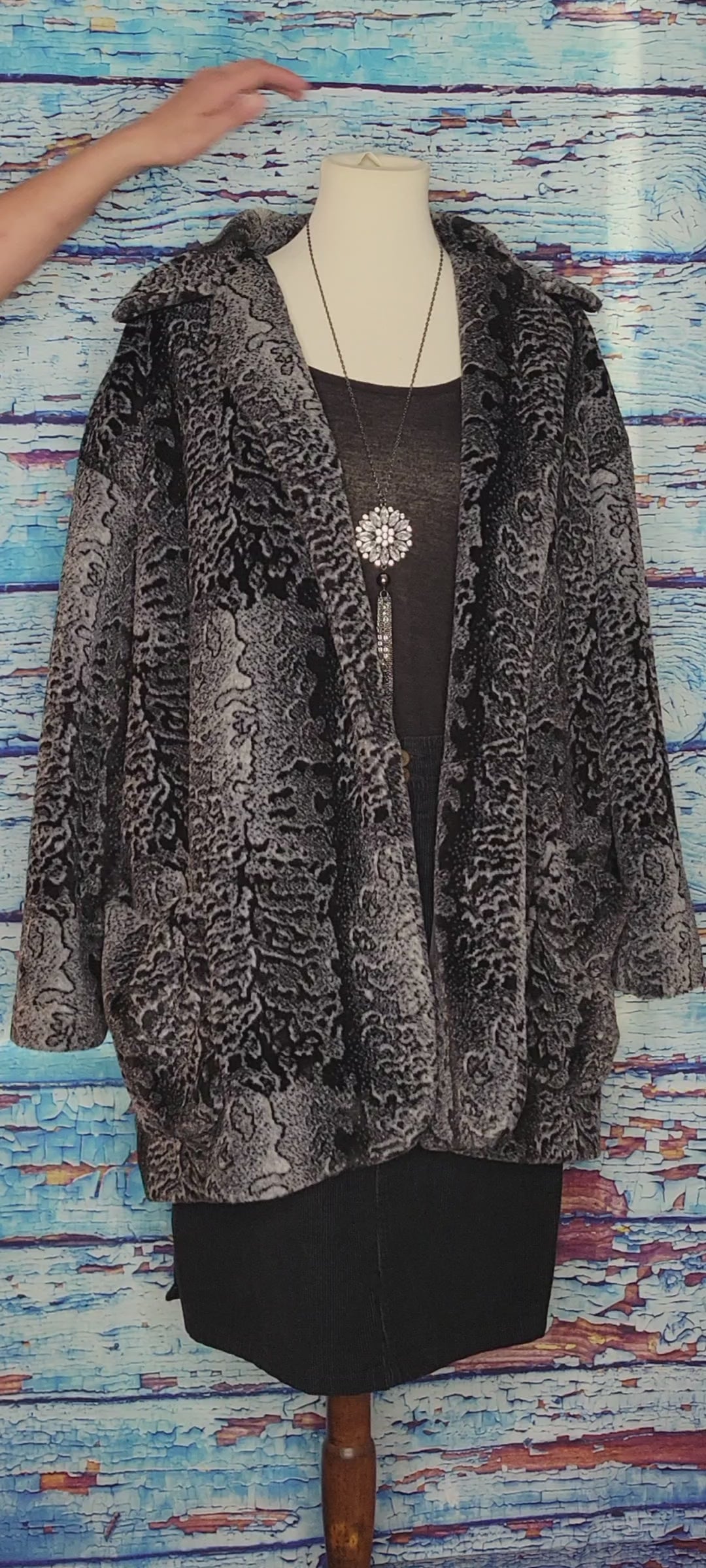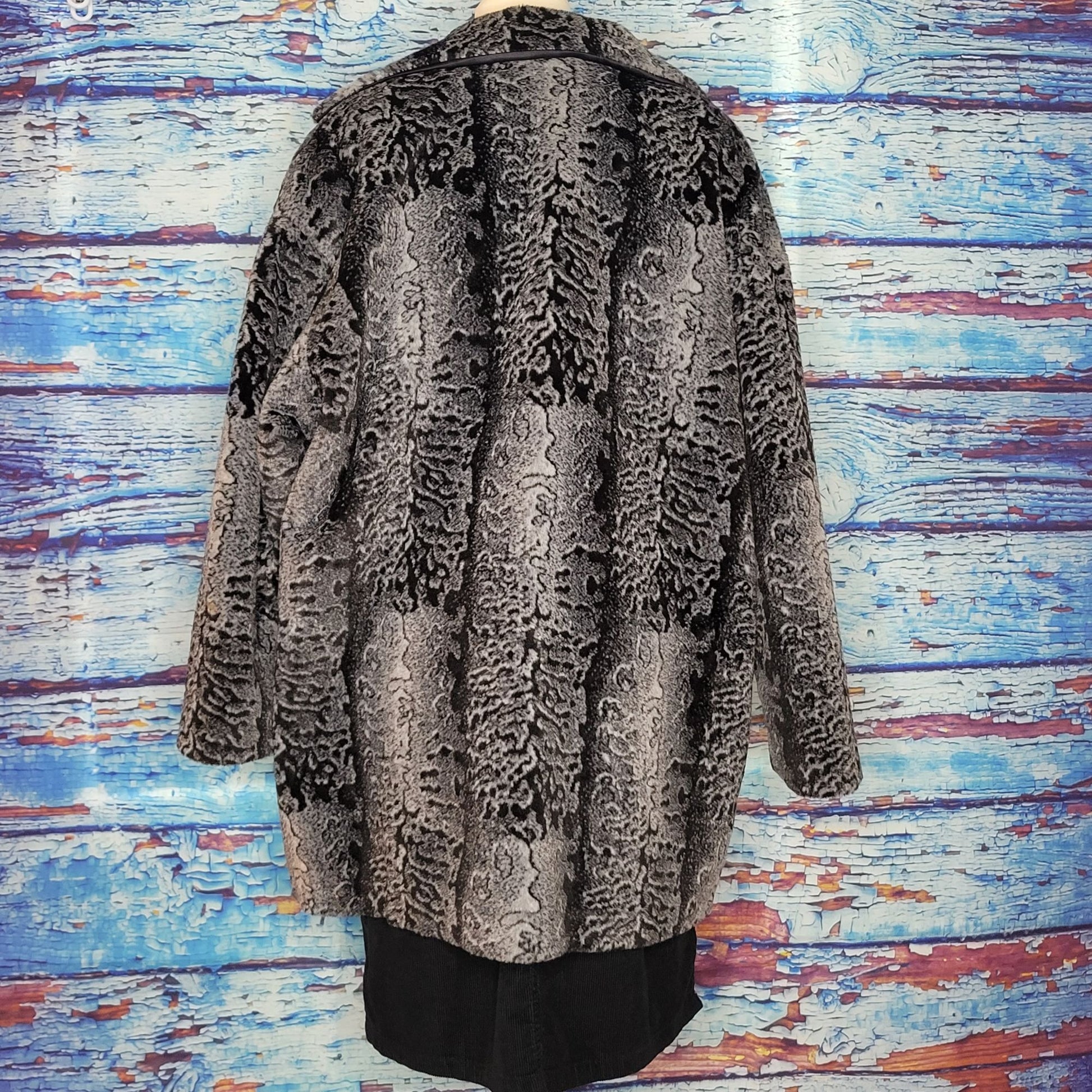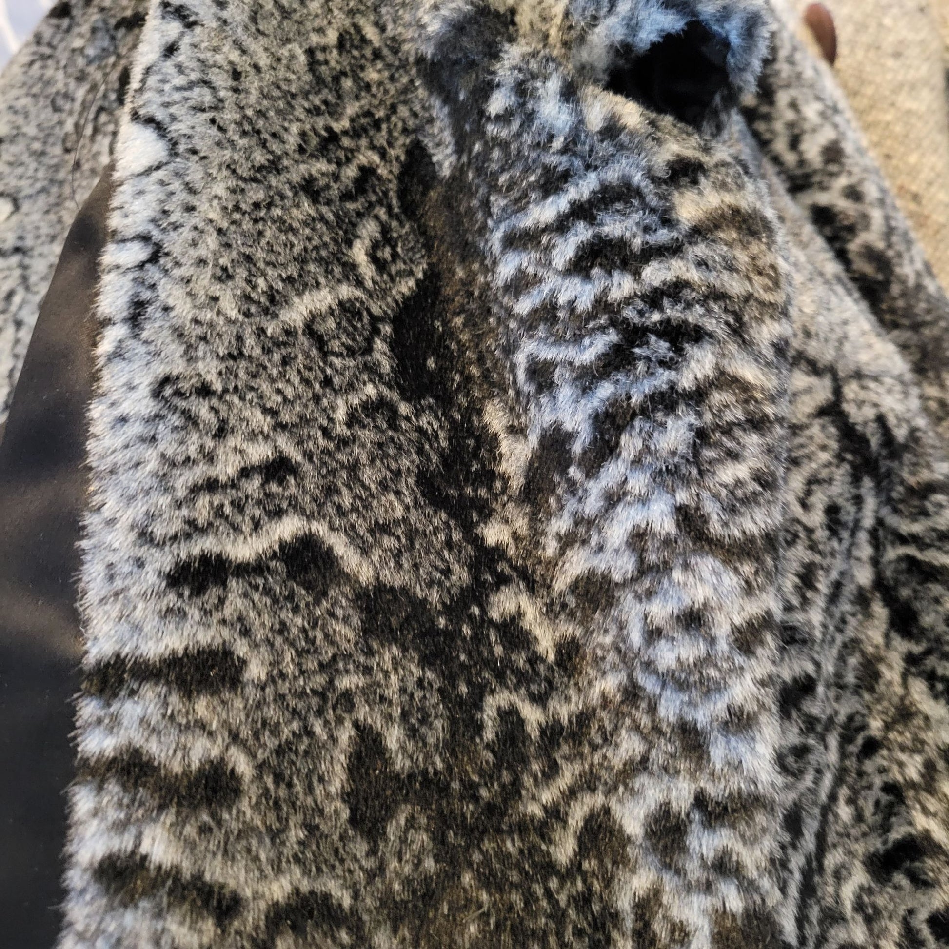 No Labels. Fully Lined. Pockets fully lined and intact. Black and white faux leopard fur winter coat. In very good condition. No apparent stains or holes found.
