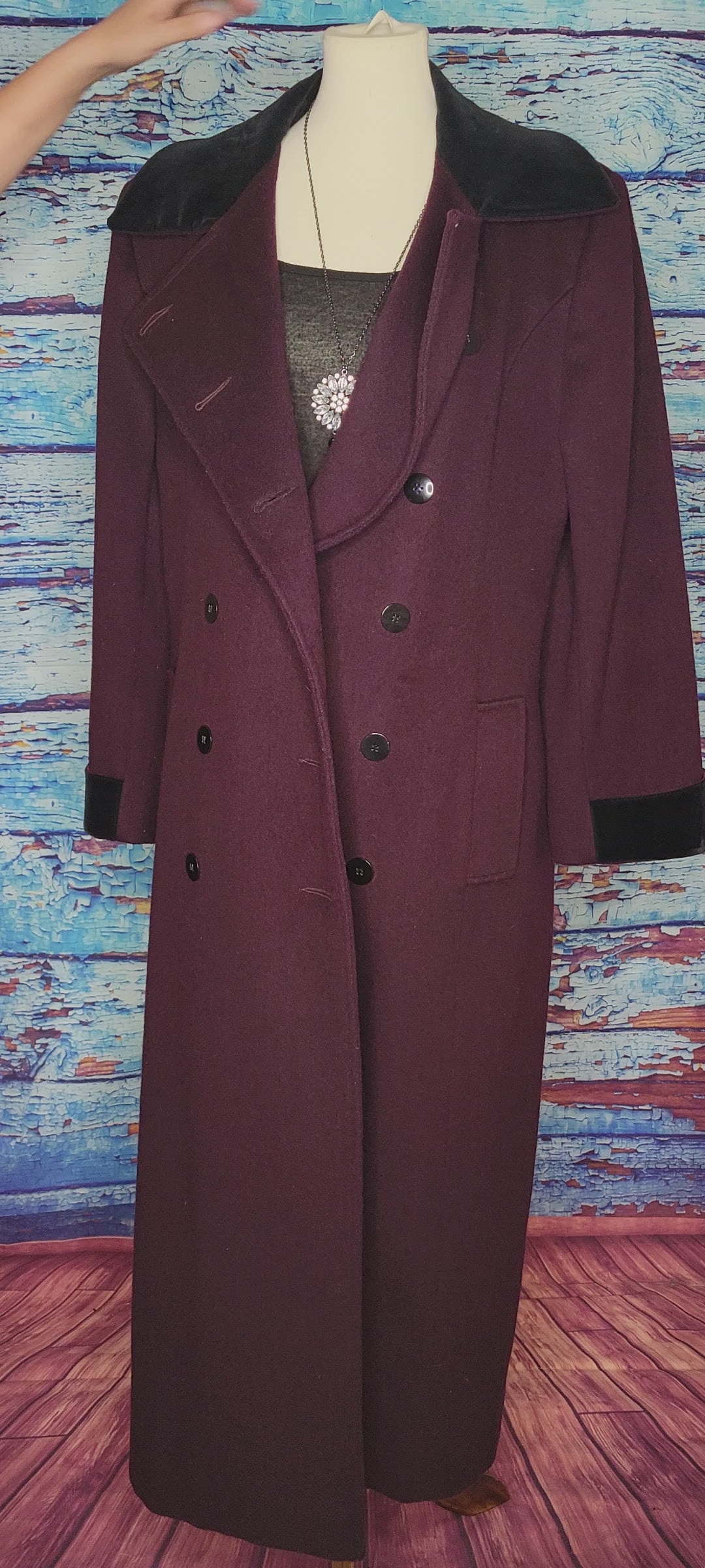 VTG Full Length Plum Colored Wool Coat w/ Velour collar and sleeves