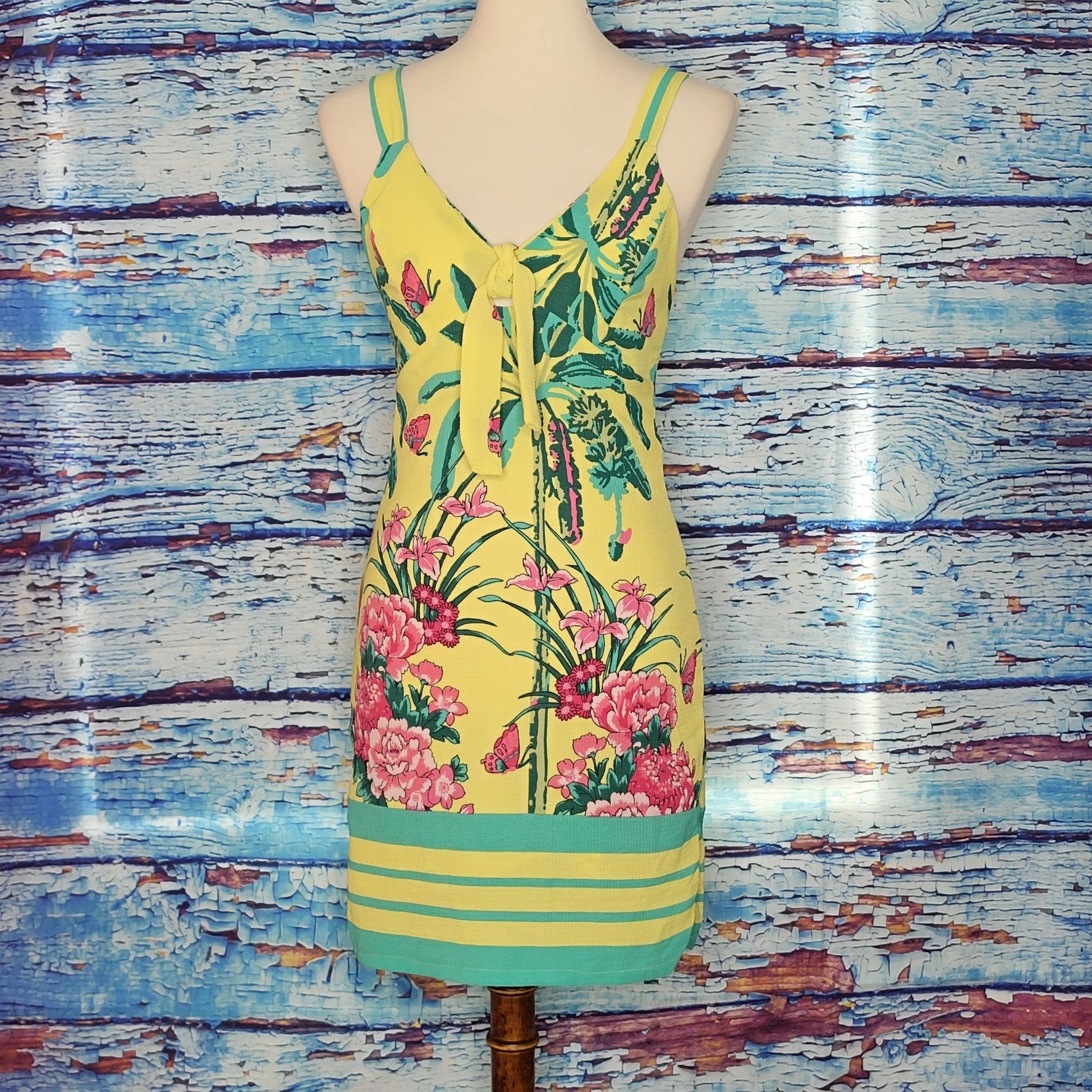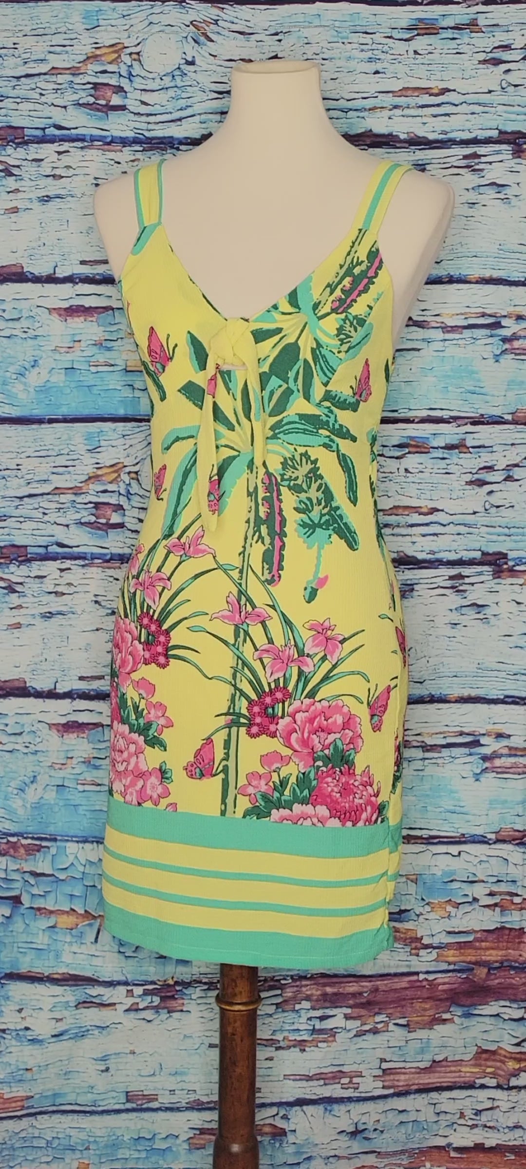 Beautiful yellow Hawaiian print pencil dress in fantastic condition. Ties in the front and zips up the back. 100% Polyester