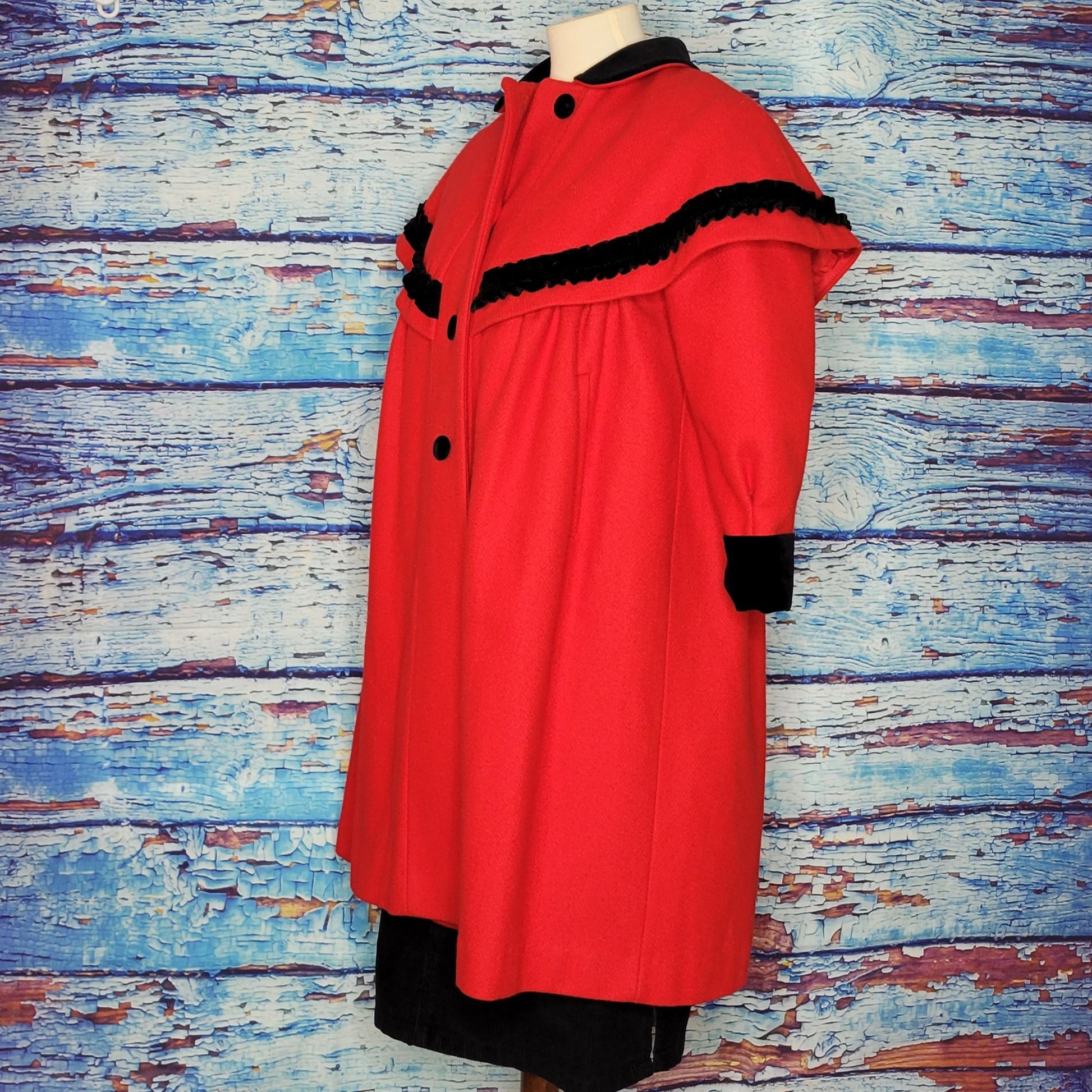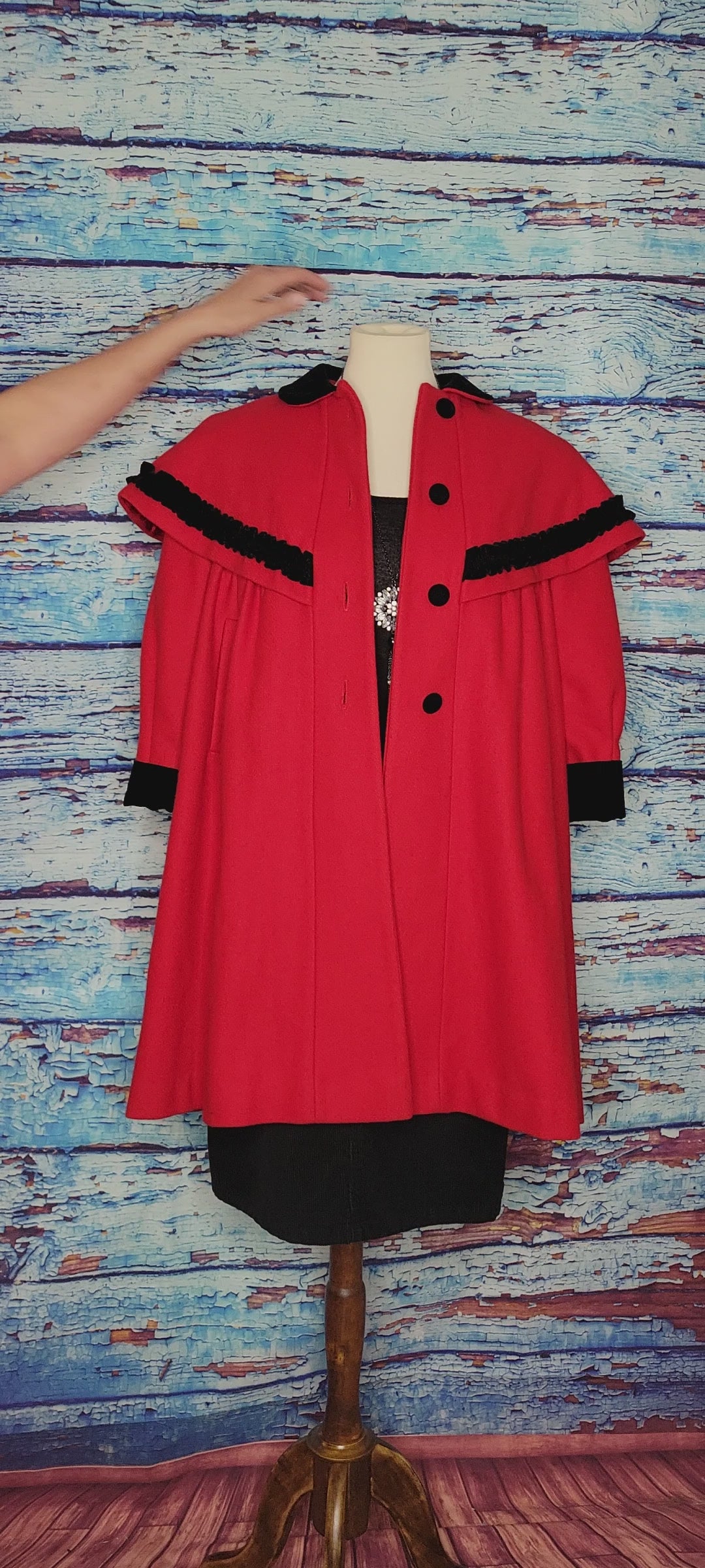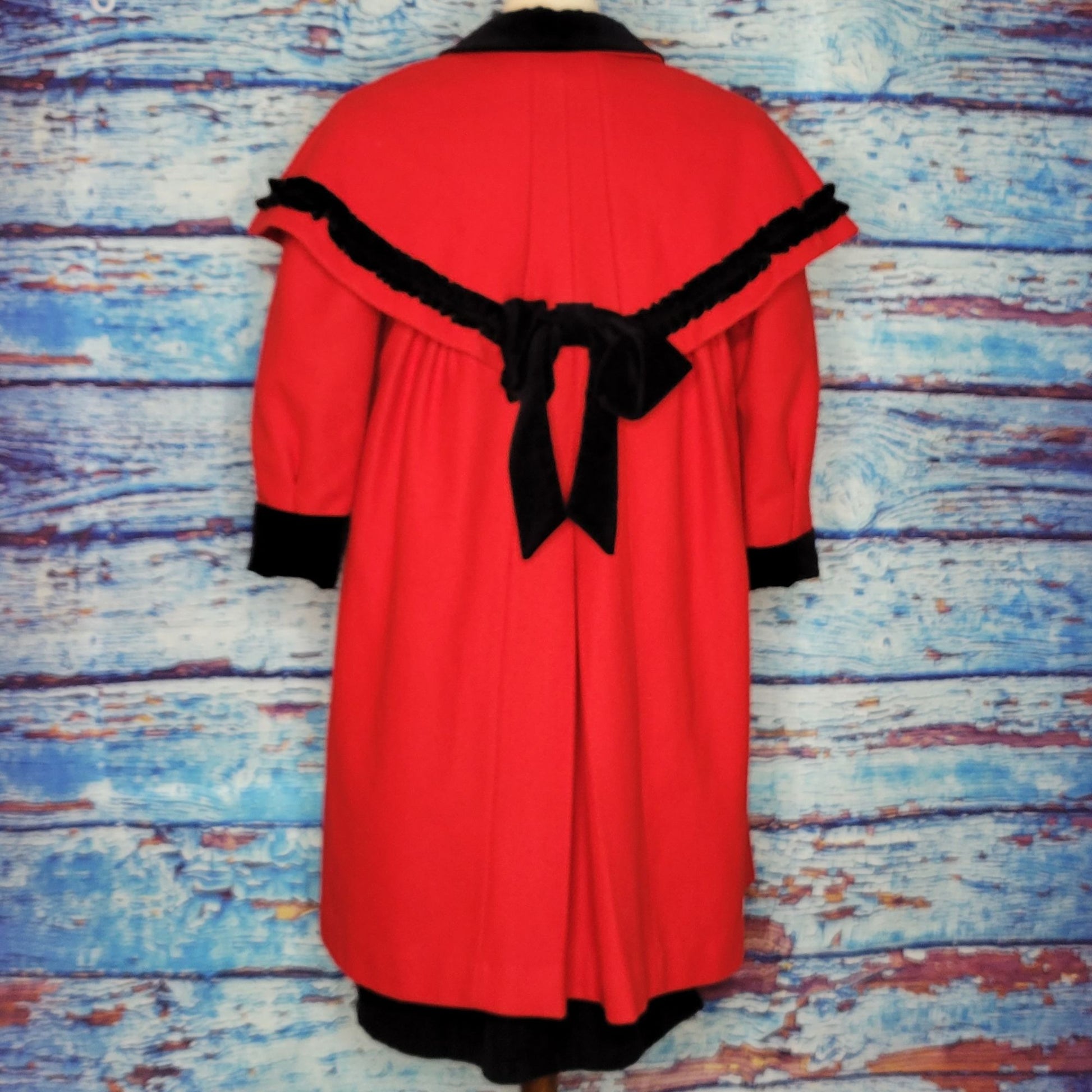 This coat is a girls size 7. Red wool with black velvet details along collar, cuffs, and bib area. In very good condition. Did not find any apparent moth marks.