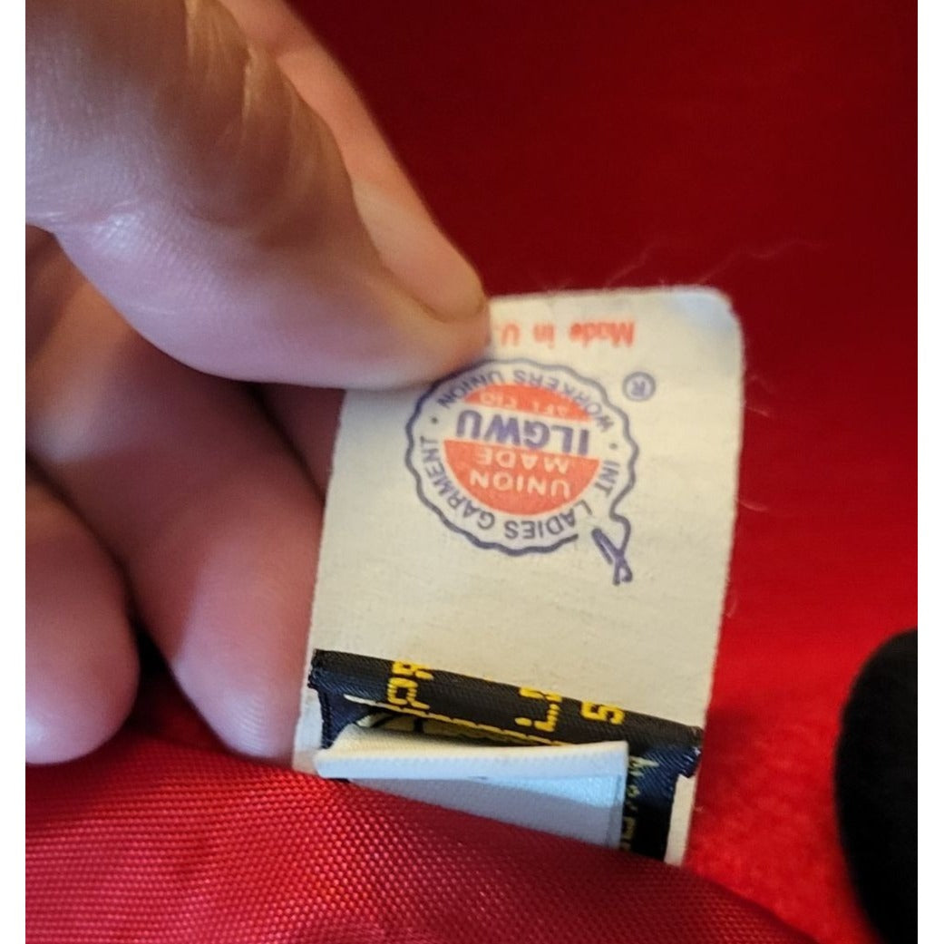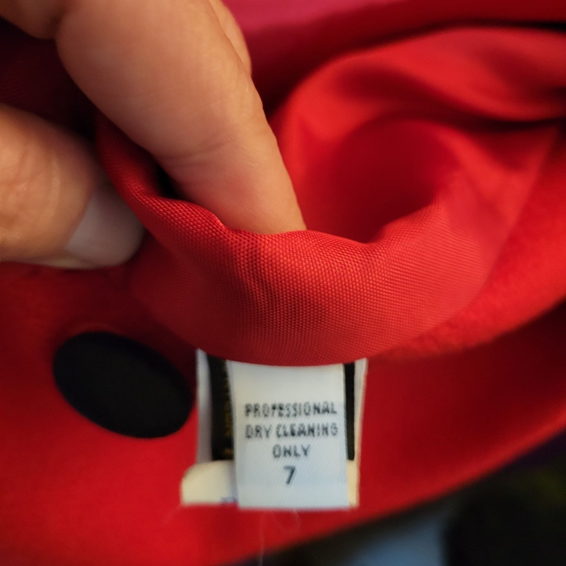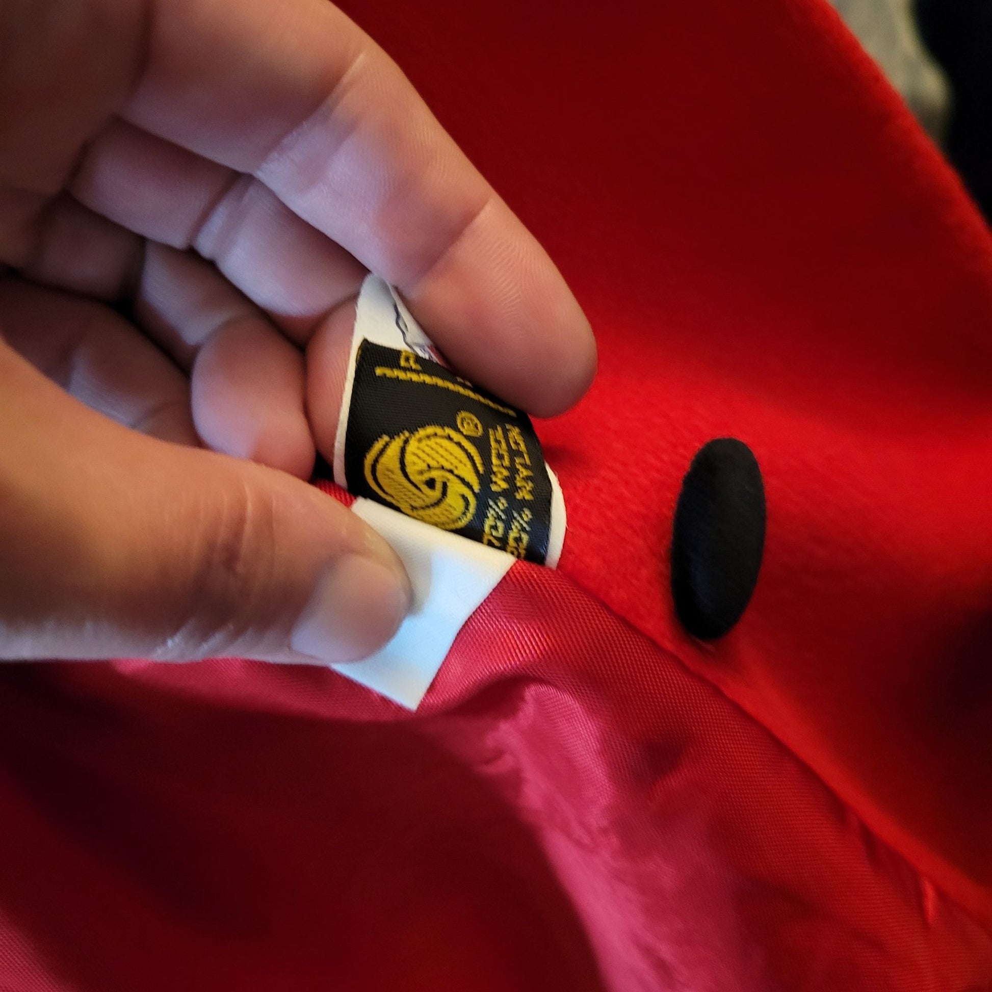 This coat is a girls size 7. Red wool with black velvet details along collar, cuffs, and bib area. In very good condition. Did not find any apparent moth marks.